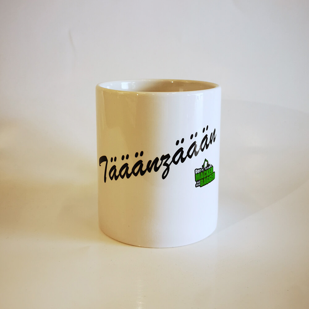 Weiße Tasse mit frontal aufgedrucktem "Tääänzäään" Schriftzug und "Macker mit dem Bagger" Logo.